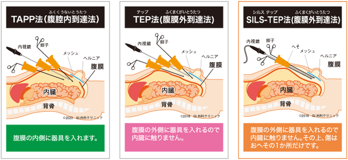 当院で行っている術式、お腹に入らない鼠径ヘルニア手術(SILS-TEP法(Single Incision Laparoscopic Surgery-Total Extraperitoneal))は、鼠径ヘルニアの治療法の一つで、特に日帰り手術に向いています。