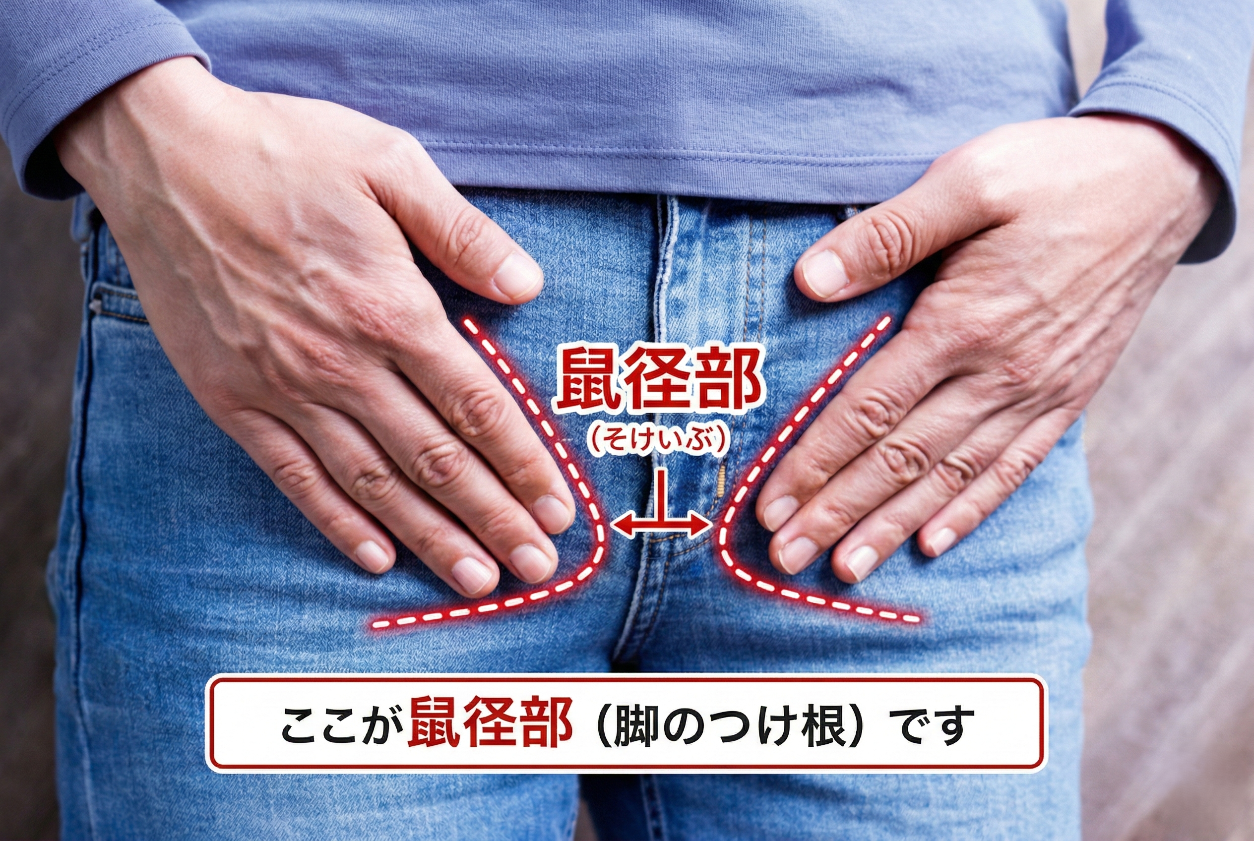鼠径部(そけいぶ)とは、脚の付け根(太ももの付け根)から下腹部にかけての部分を指します。