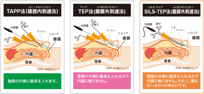 近年は「腹腔鏡手術+メッシュ補強」が主流で、当院ではお腹に入らない日帰り手術(SILS-TEP法)を採用しています。
