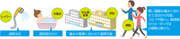個人差はありますが、手術翌日あるいは翌々日から職場や学校に復帰できます。(術後経過には個人差もあり、社会復帰の時期が遅れることもあります。)