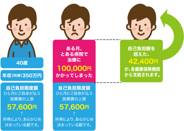 このAさんが、ある月にある病院で治療費が10万円かかってしまいました。しかし、このAさんの自己負担限度額は57,600円なので、自己負担限度額を超えた42,400円が加入する健康保険機関から支給されます。つまり、治療に10万円かかっても患者さんが実際に負担する費用は57,600円ですみます。