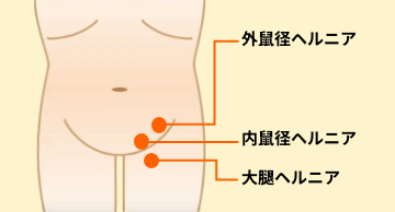 外鼠径ヘルニアとは、鼠径管を通って腸管等の内臓が腹膜に包まれて脱出する病態です。下腹壁動静脈の外側にある内鼠径輪から飛び出してくるため、外鼠径ヘルニアもしくは間接型へルニアと呼ばれます。、鼠径部ヘルニアのなかでは最も多く見られます。